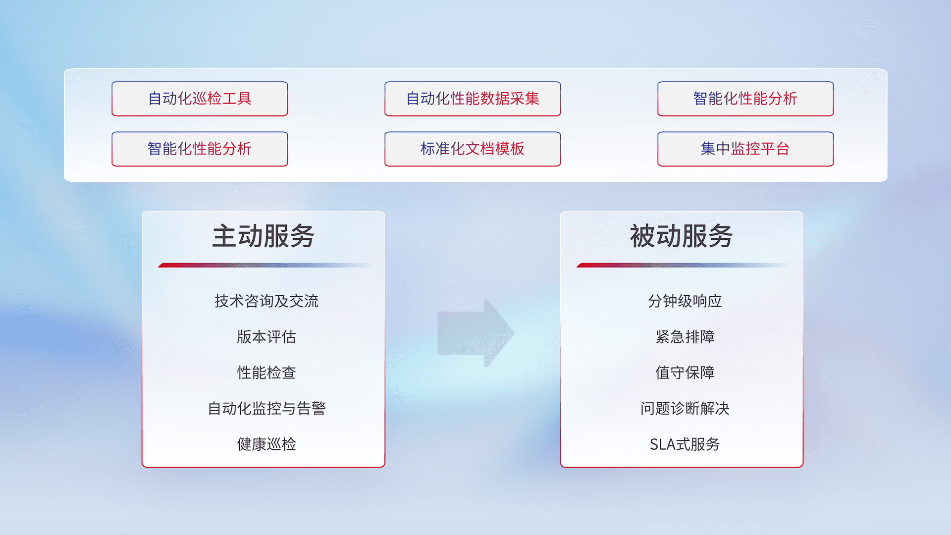 智能化工具和标准化文档,,,保障服务质量,,,,提供主动服务(包含技术咨询、、、、版本评估、、、性能检查、、、自动化监控与告警、、健康巡检)和被动服务包含(分钟级响应、、、紧急排障、、、值守保障、、、问题诊断解决、、、、SLA服务)。。